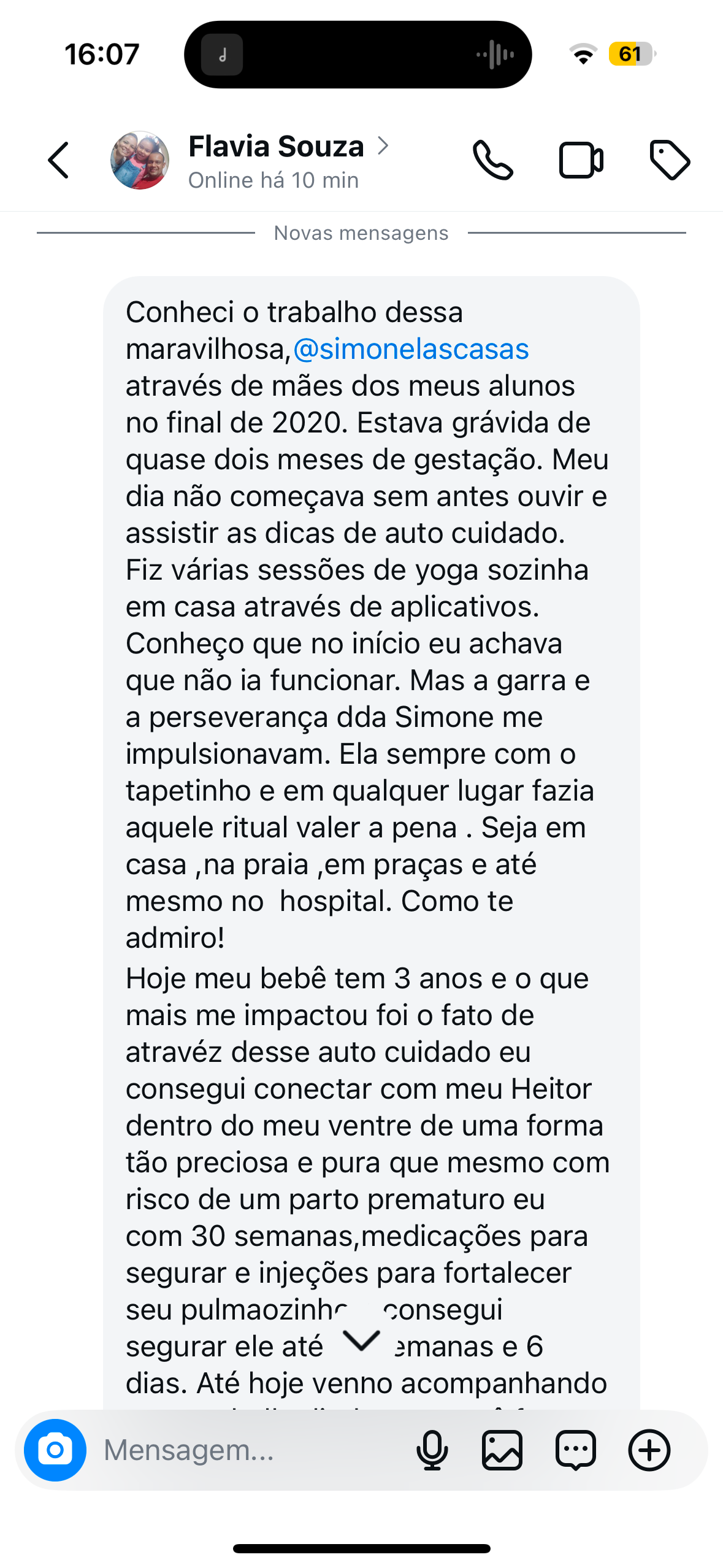 Sou Simone Las Casas, empresária, especialista em bem-estar e professora de yoga há mais de 15 anos. Minha missão é ajudar mulheres, especialmente mães, a se reconectarem consigo mesmas e encontrarem equilíbrio em meio às suas múltiplas responsabilidades, como mulheres, profissionais, esposas e mães.
